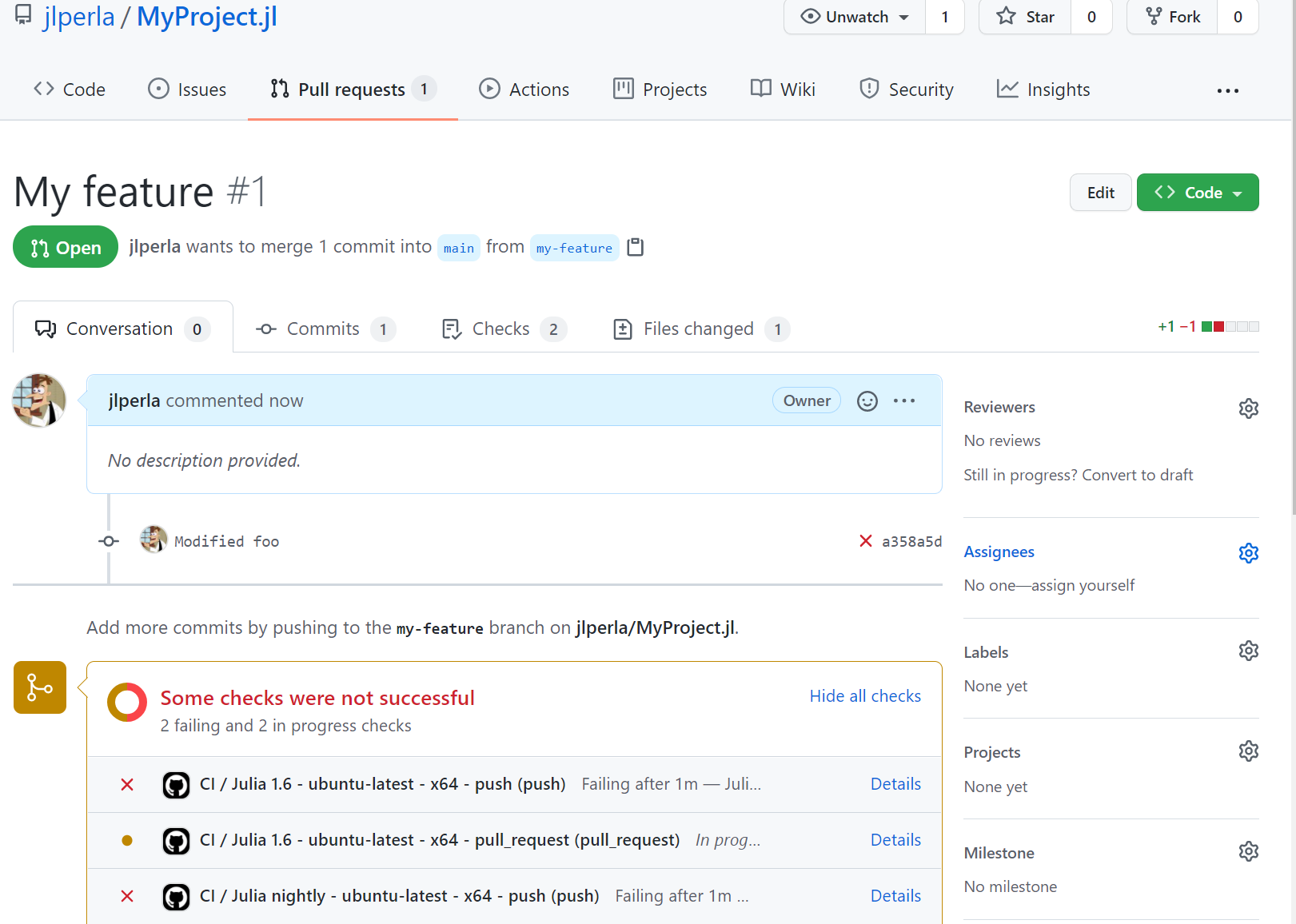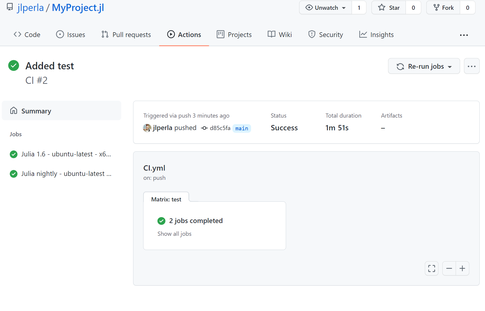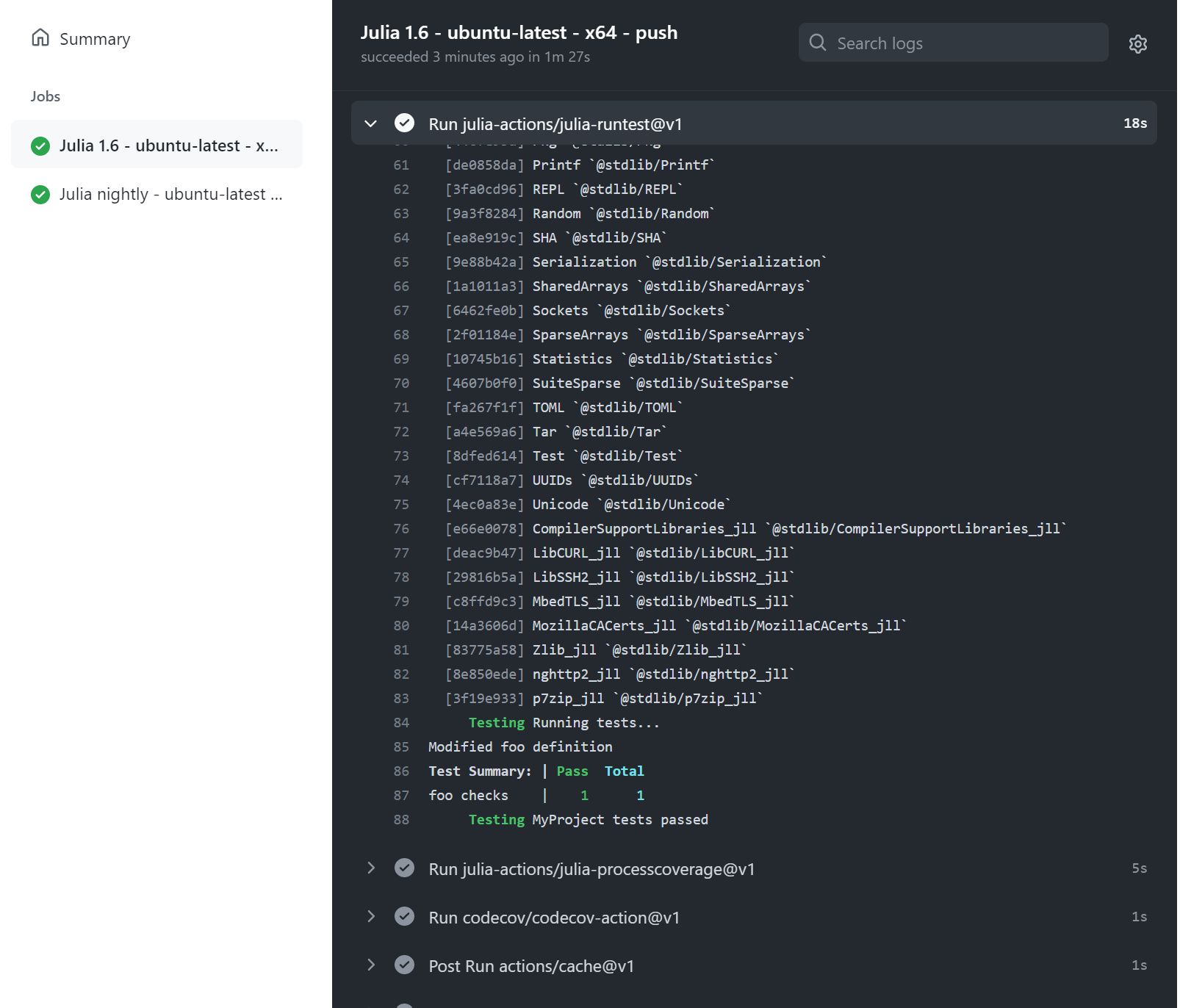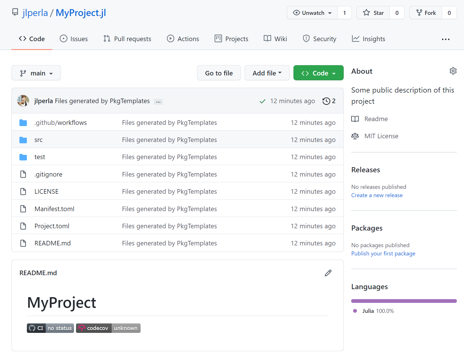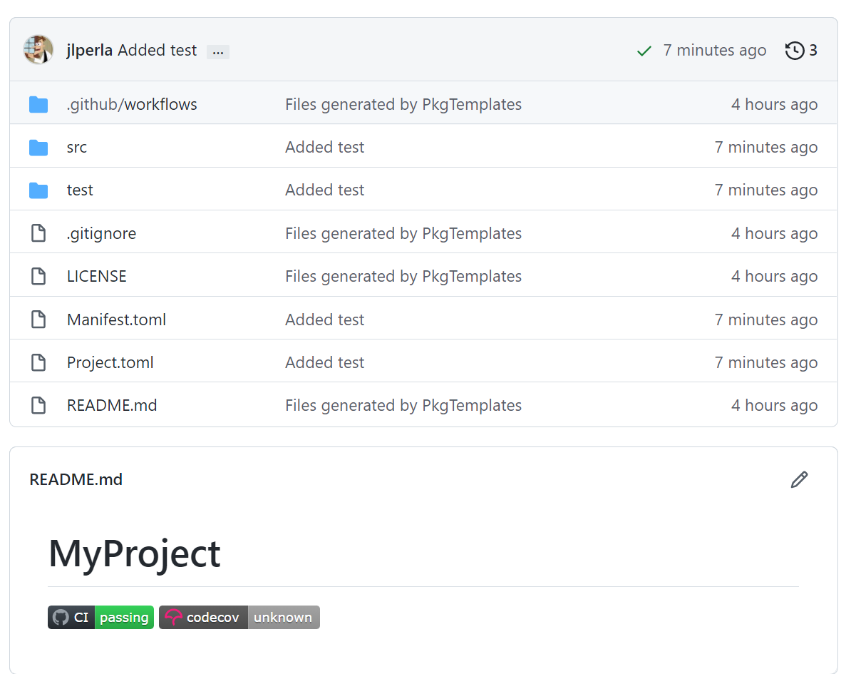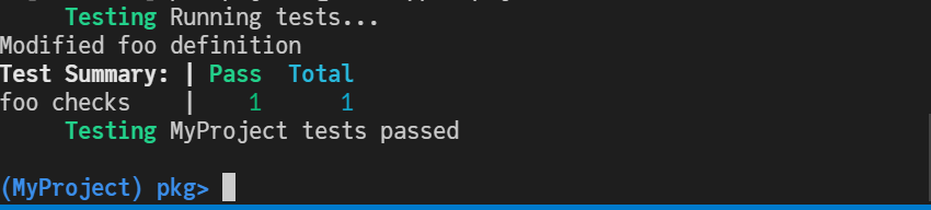 And anything else you can think of. You should be able to run ] test for the project to check that the test-suite is running, and then ensure that it is running automatically on GitHub Actions CI.