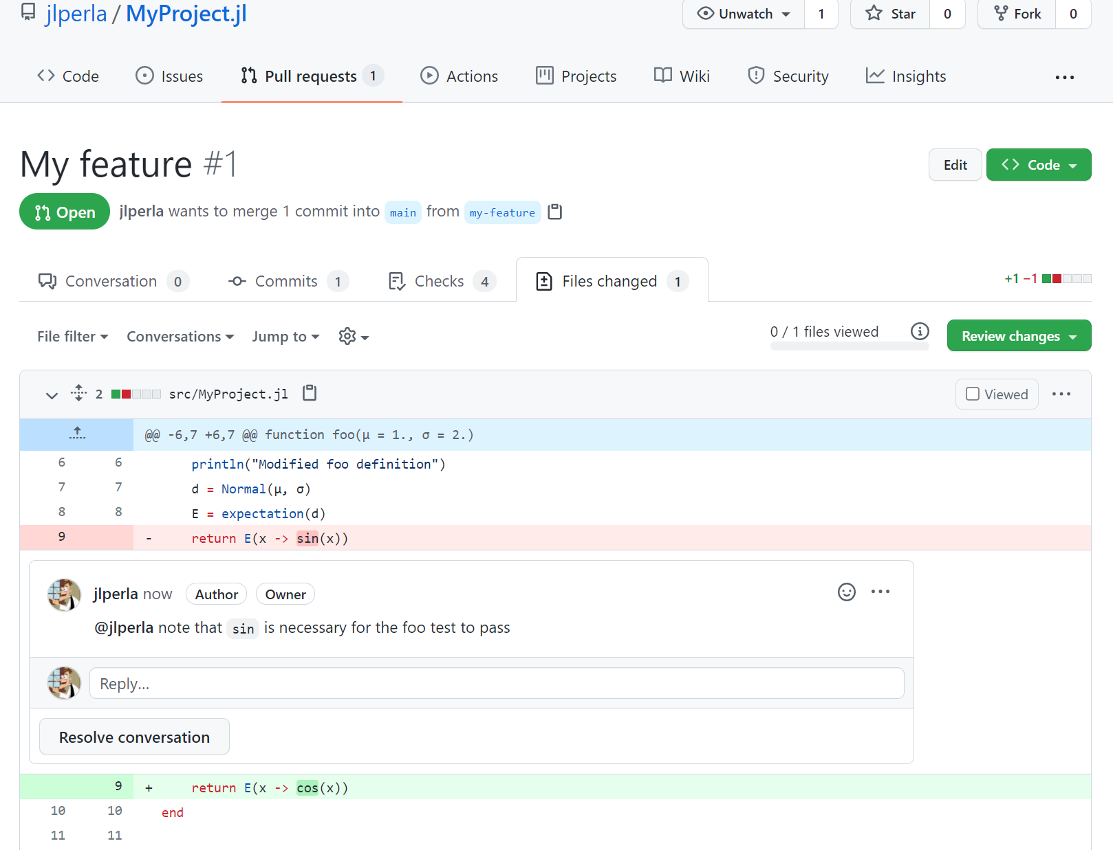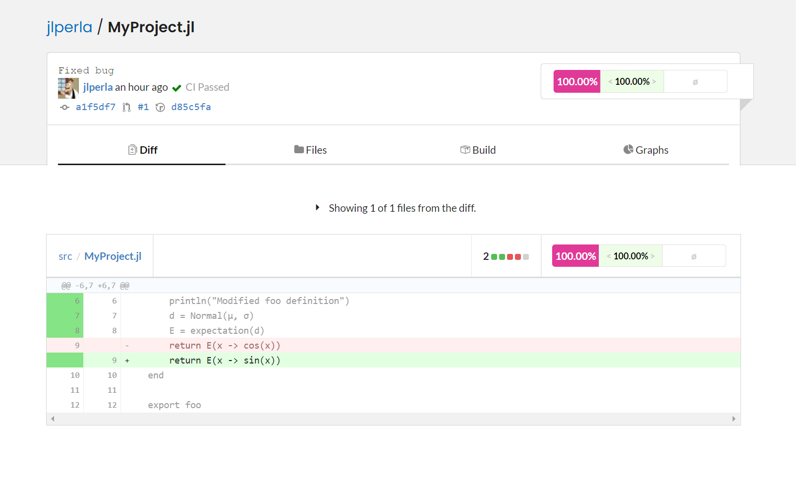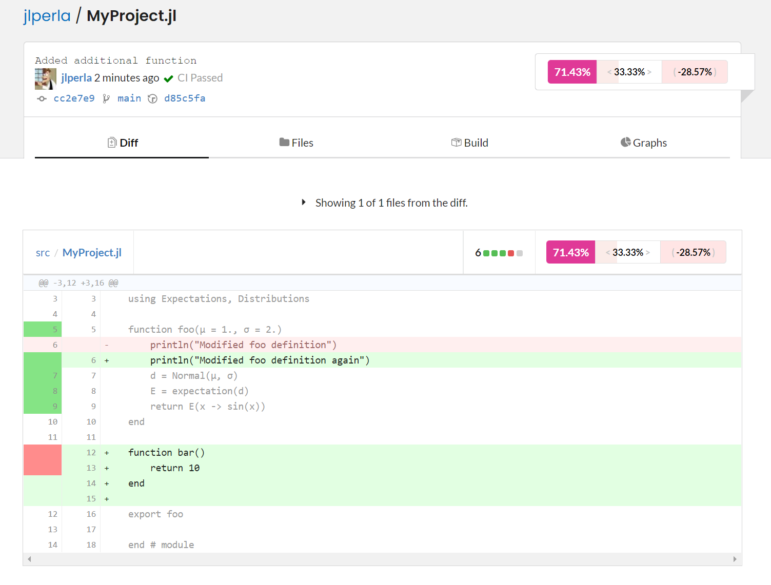 Furthermore, it highlights in red the new code in this commit which led to the lowered code coverage. In this case, the bar function had nothing in runtests.jl that was calling it. This can help you ensure that all of the code paths (not just entire functions) are called in one test or another in your unit tests.