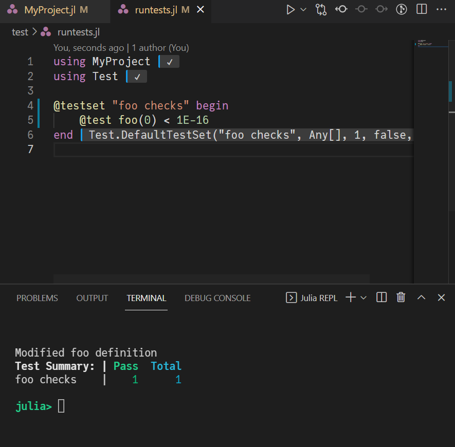 By using <Shift+Enter> in VS Code or Jupyter on the testset, you will execute them all. You may want to execute only parts of them during development by commenting out the @testset and end and execute sequentially until the suite passes.